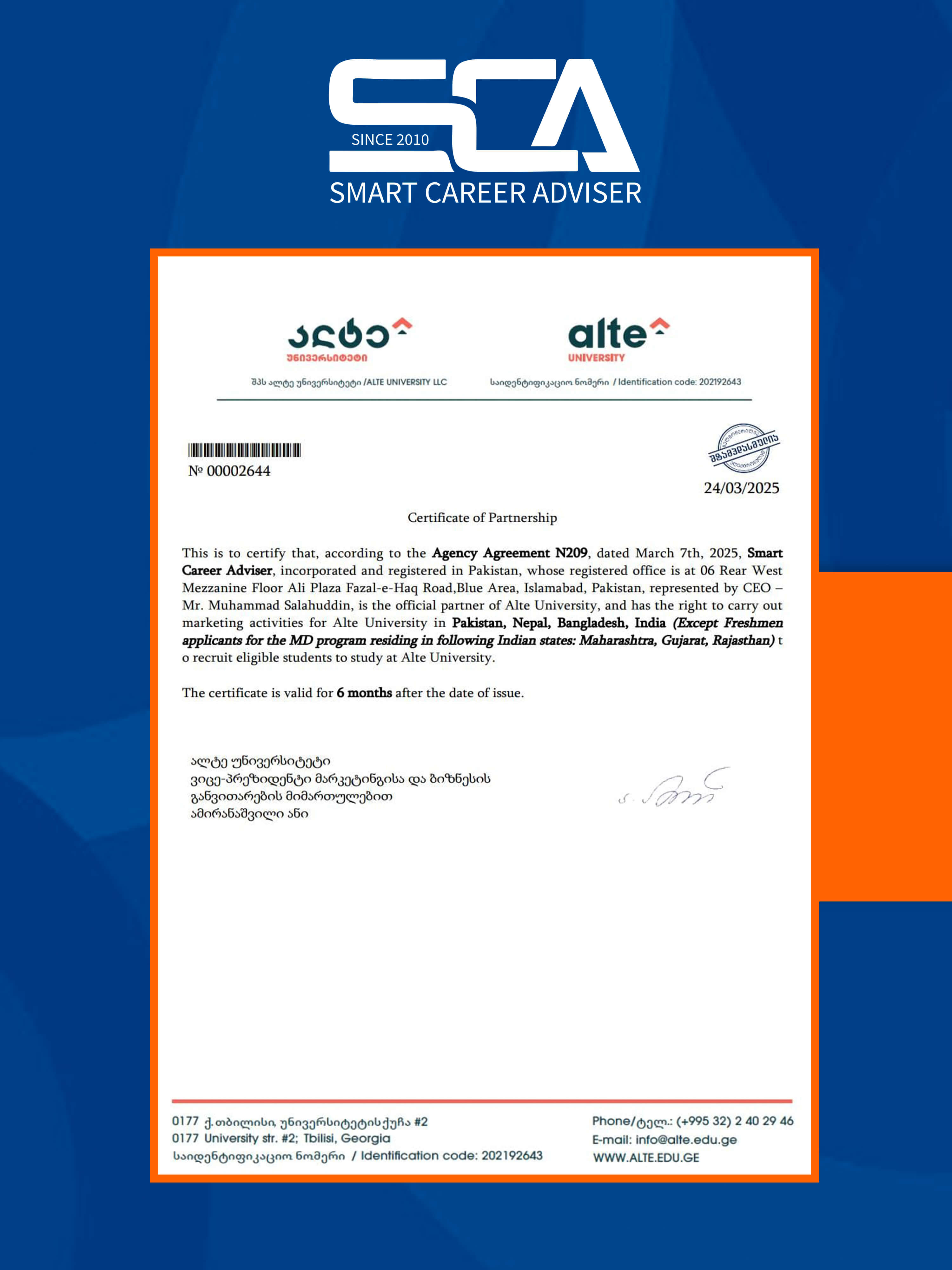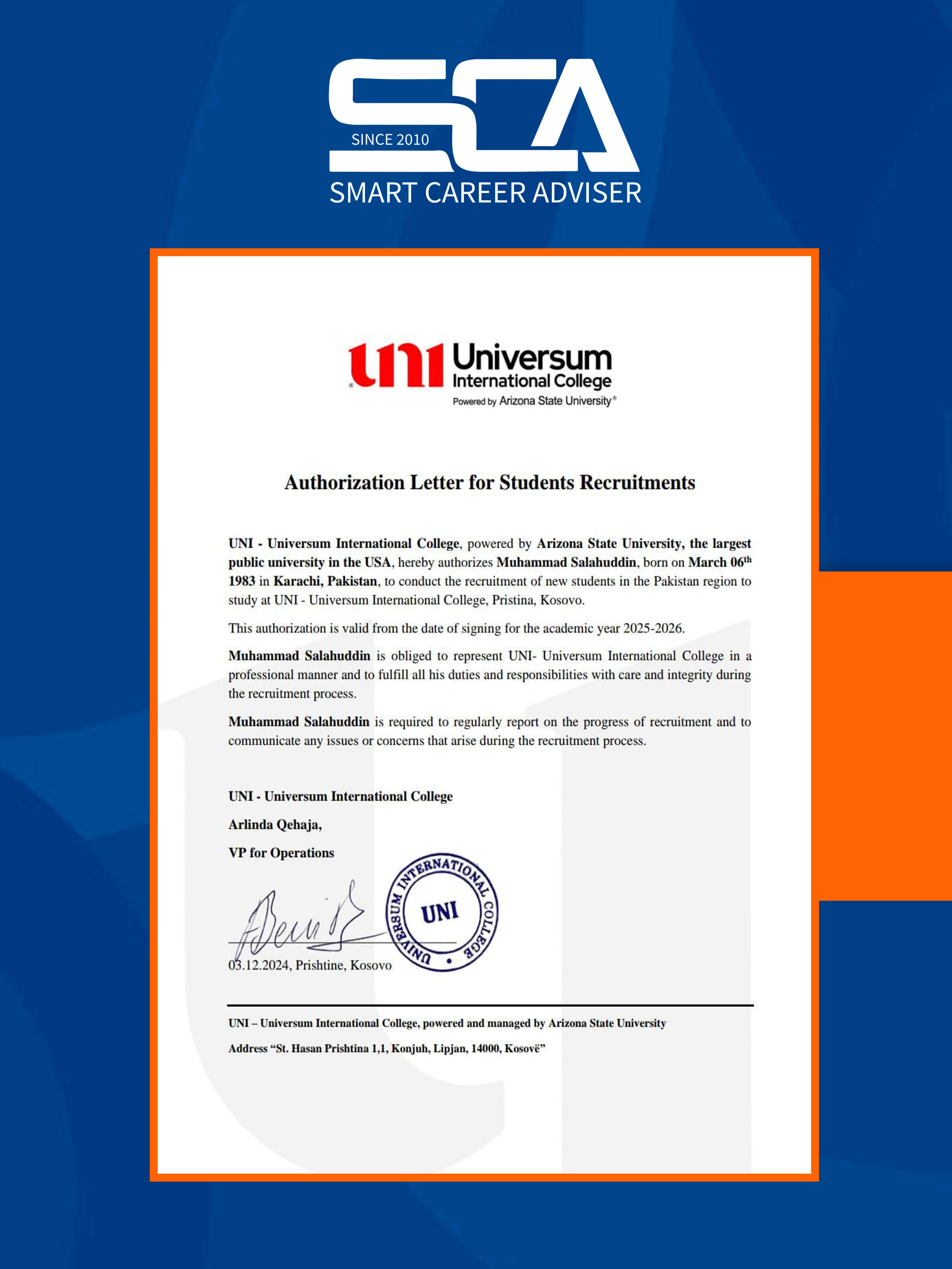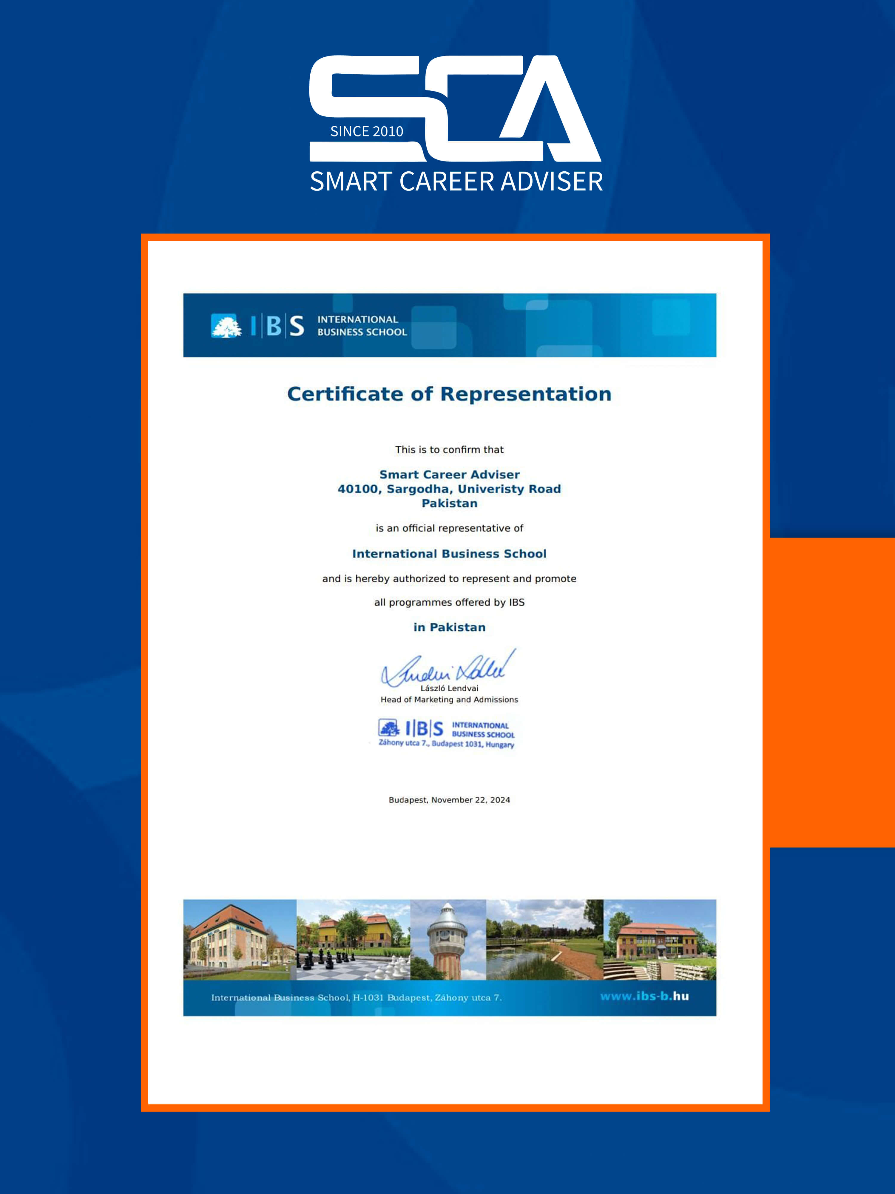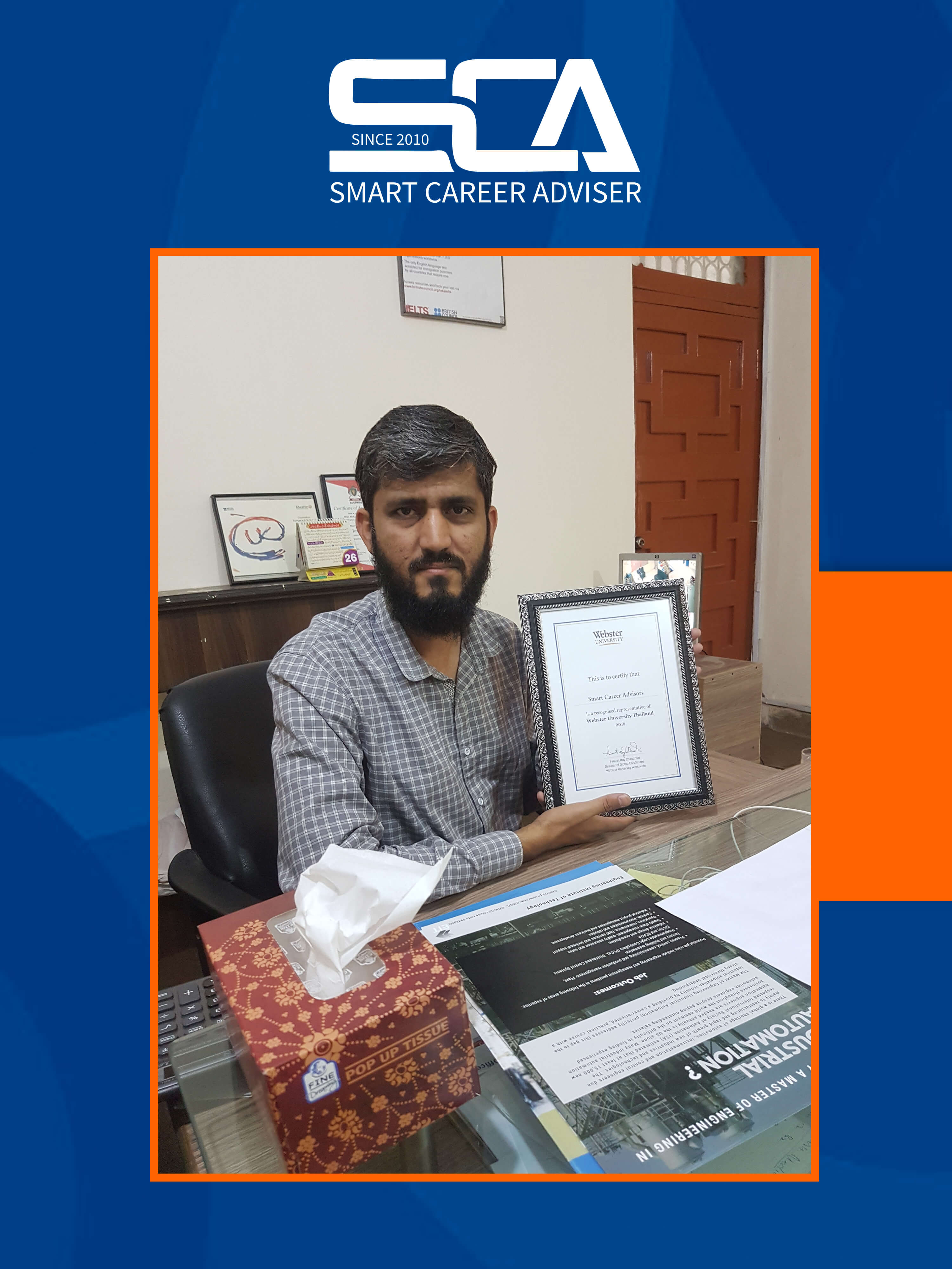 Smart Career Adviser (SCA) is a trusted study-abroad consultancy that has been guiding students toward global education opportunities since November 2010. With a strong reputation built on transparency, professionalism, and student-centered guidance, SCA provides comprehensive support from course and university selection to admission processing, visa assistance, and pre-departure services. With offices in Pakistan and Türkiye, Smart Career Adviser works with dozens of reputable institutes and organizations worldwide. Our network includes universities, colleges, and high schools across Australia, USA, UK, Türkiye, Hungary, Spain, Germany, Lithuania, Finland, Sweden, Malaysia, and Thailand, both directly and through our trusted associates. For over a decade, SCA has remained committed to helping students make informed decisions and pursue successful academic and career pathways abroad. Our goal is simple: to provide reliable information, ethical counseling, and end-to-end support so every student can achieve their international education dreams with confidence.